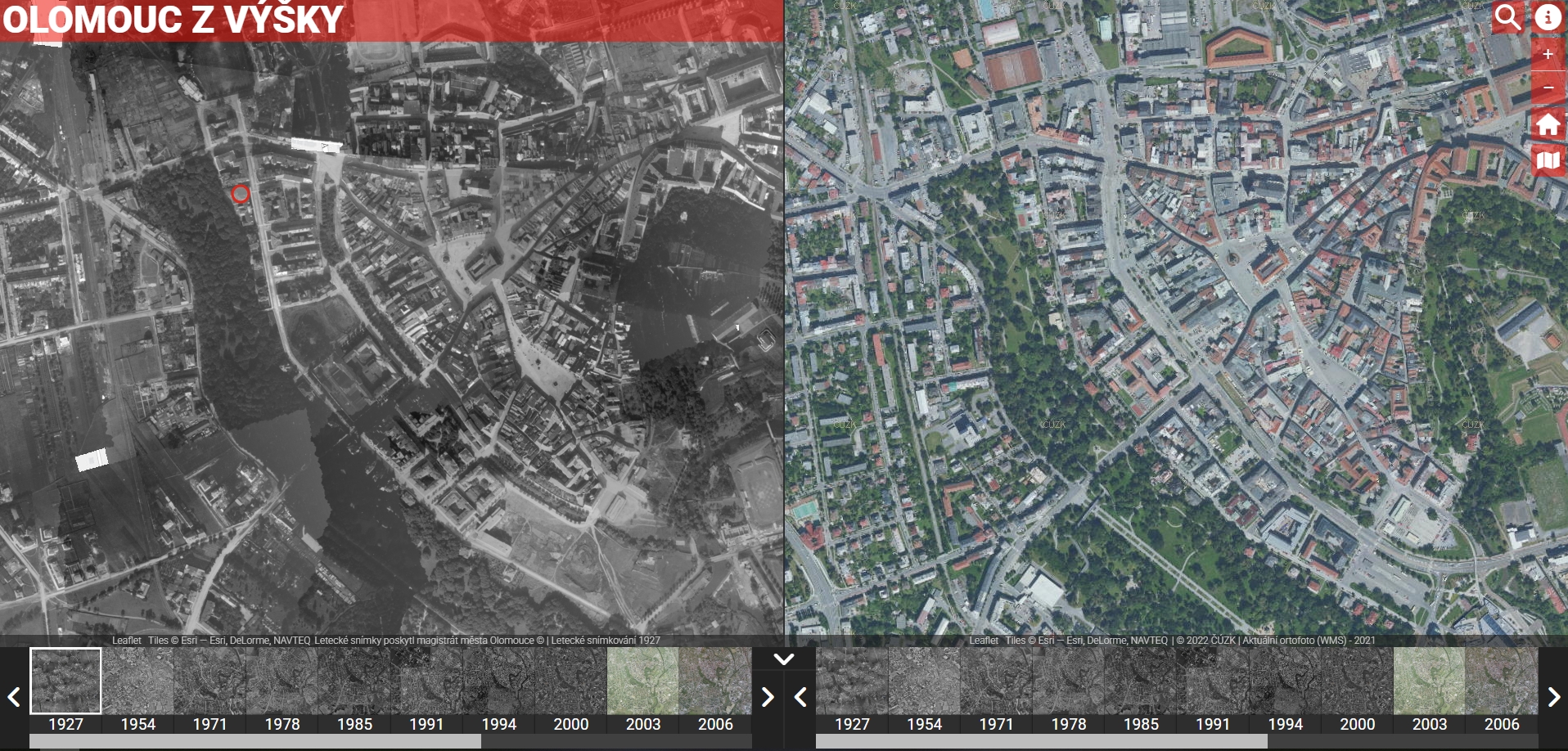 Původní mapová aplikace nabízející letecký pohled na Olomouc. Výstup diplomové práce vytvořené na Katedře geoinformatiky UP.